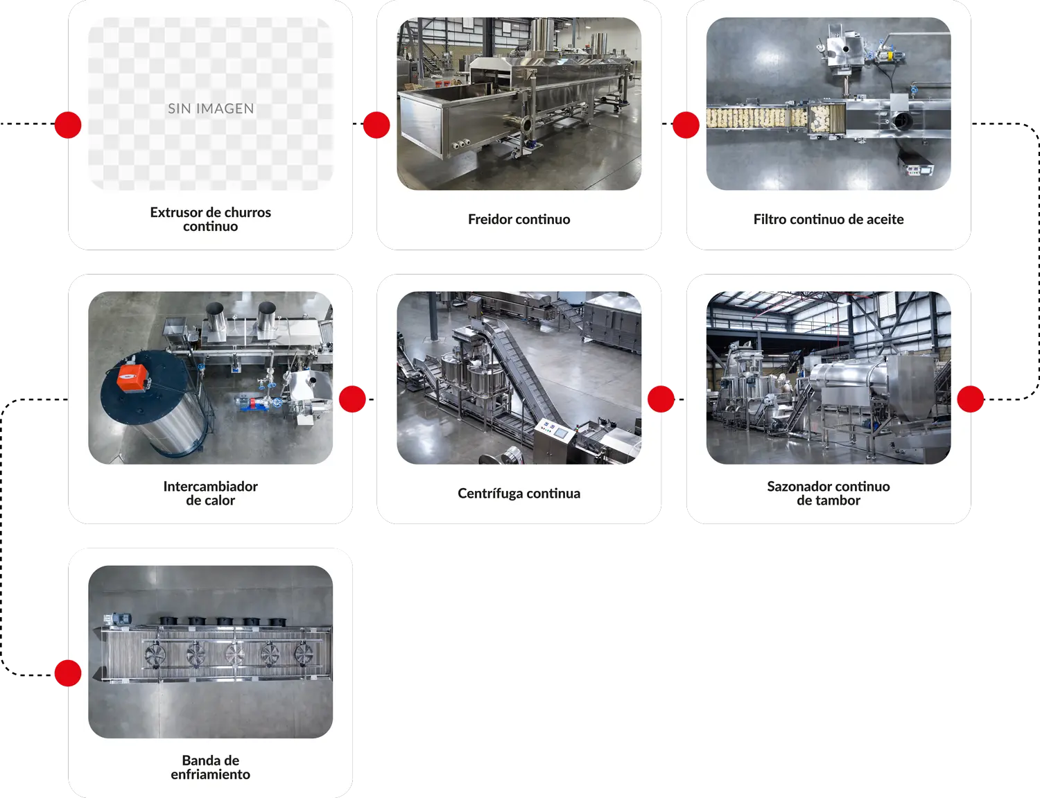 Nuestra línea continua y totalmente automatizada de churritos de maíz está diseñada para ofrecer producción estable, alta eficiencia y calidad consistente, incluso en operaciones de gran volumen. El sistema integra un extrusor continuo de alta precisión, equipado con tolvas independientes para harinas, agua y sazonadores, cada una con control de velocidad variable, garantizando formulaciones exactas y repetibles.